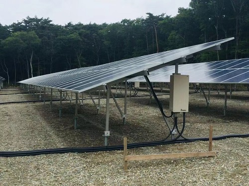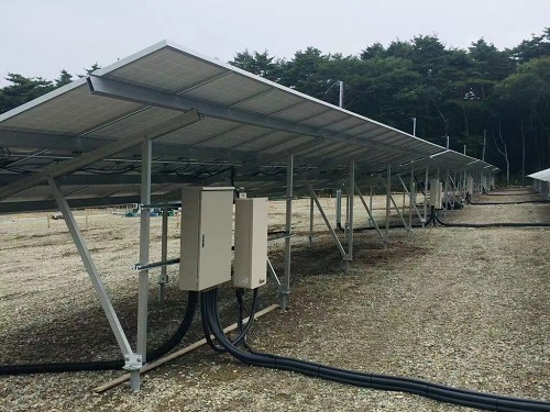 Kingfeels Energy a installé un projet de système d'installation solaire au sol au Japon et a installé l'onduleur directement sur la structure du panneau avec une capacité totale de 2 MW.